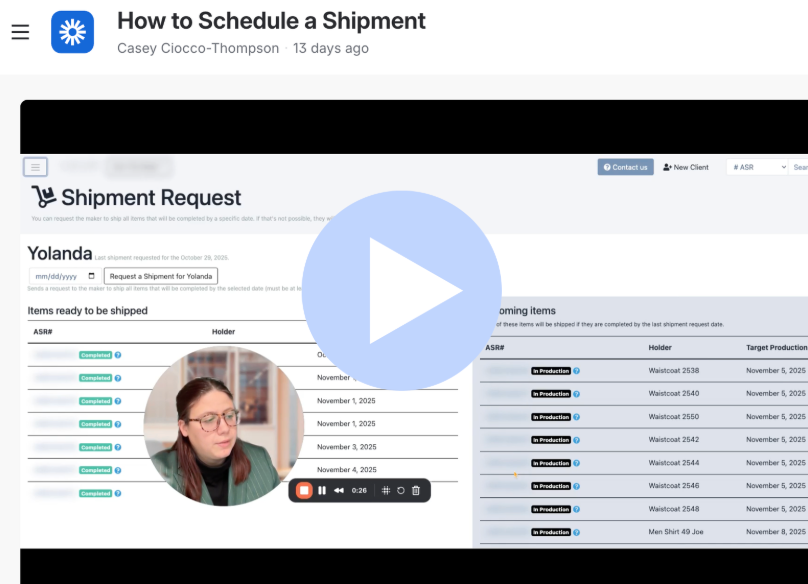 When you click the "Request a Shipment for Yolanda" button at the top of the list, all of your items that are ready will be shipped within the maker’s next 2 working days (or, the day you request from the calendar). When the request is sent, these lists will be empty (since all active items are planned for a shipment). The last request date will also be at the top of the page (next to "Yolanda"). If any upcoming items become ready in the meantime, they’ll also be included. You will not be able to choose specific items to ship - everything that’s ready will be sent.